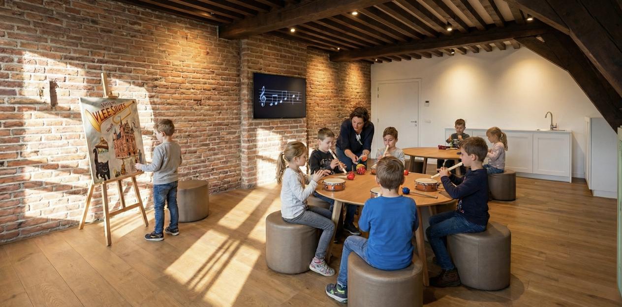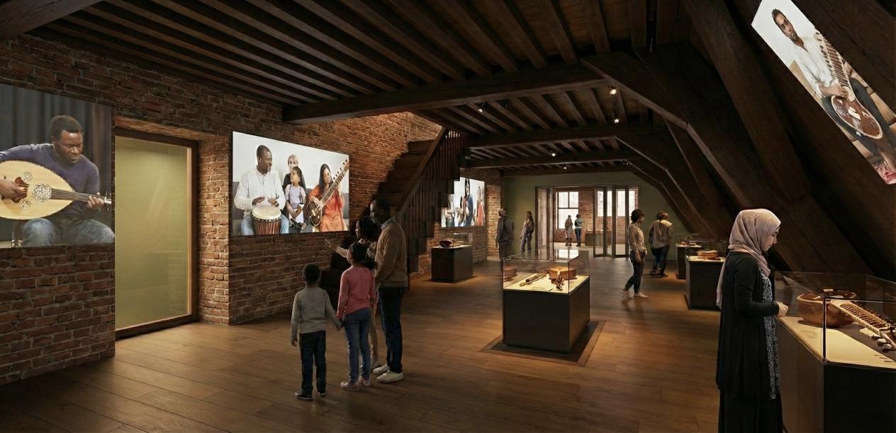Even verderop ga je zelf aan de slag. Midden in het museum, maar toch visueel en auditief afgesloten van de andere zalen, vind je onze educatieve ruimte. Dé plek waar groot en klein kan deelnemen aan workshops, luister- en leermomenten of in groep kan musiceren.